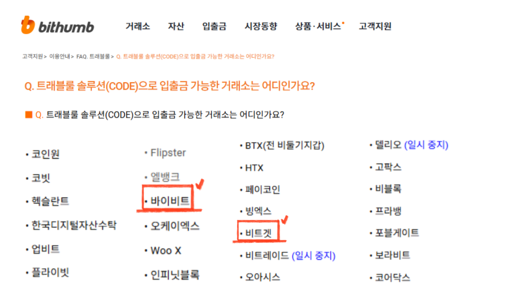 빗썸에서는 하단 바이비트,비트겟에 입출금이 원활하게 가능하게끔 채택되어 있습니다.