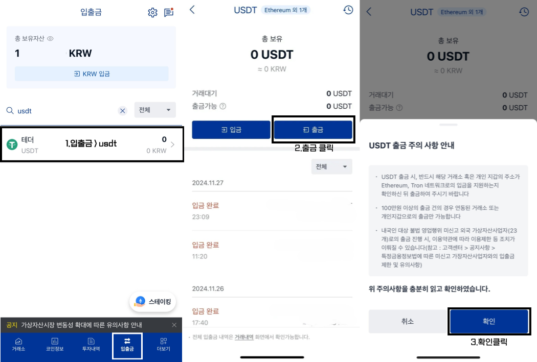1.하단 입출금 들어가셔서 검색창에 USDT 혹은 테더 검색 클릭