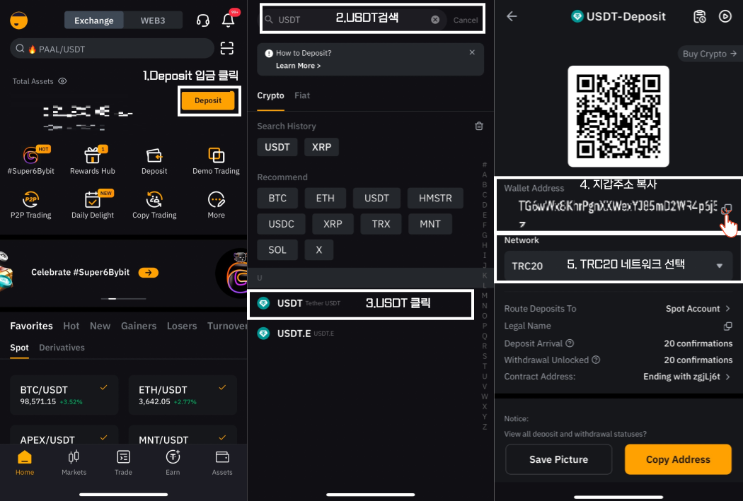1.바이비트 모바일 로그인 하신후 메인화면 Deposit 혹은 Asset(지갑) 들어가셔서 Deposit