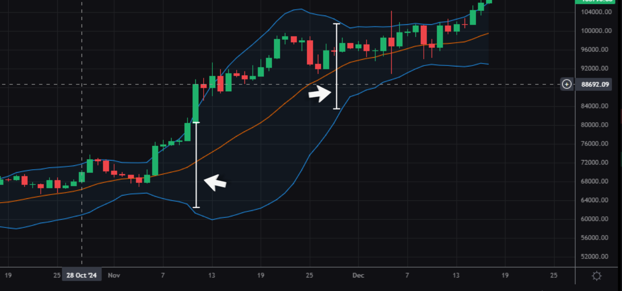 자산 가격이 상단 밴드 위로 이동하면 과매수 된 것으로 간주되며, 가격이 하단 밴드 아래로 떨어지면 과매도 된 것으로 간주합니다.